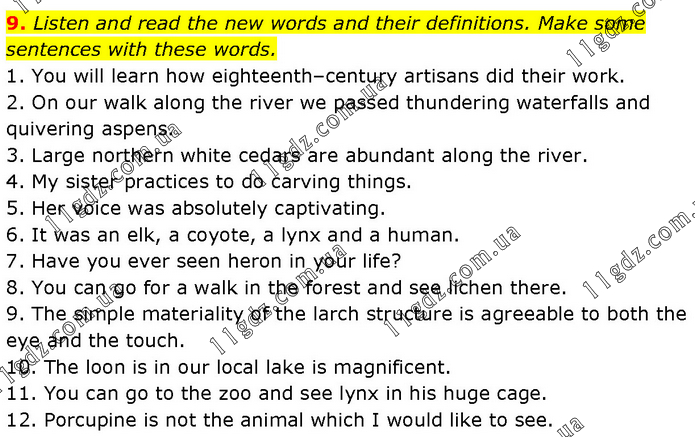 Listen and read the new words and their definitions. Make some sentences with these words. 1. You will learn how eighteenth–century artisans did their work. 2. On our walk along the river we passed thundering waterfalls and quivering aspens. 3. Large northern white cedars are abundant along the river. 4. My sister practices to do carving things. 5. Her voice was absolutely captivating. 6. It was an elk, a coyote, a lynx and a human. 7. Have you ever seen heron in your life? 8. You can go for a walk in the forest and see lichen there. 9. The simple materiality of the larch structure is agreeable to both the eye and the touch. 10. The loon is in our local lake is magnificent. 11. You can go to the zoo and see lynx in his huge cage. 12. Porcupine is not the animal which I would like to see.