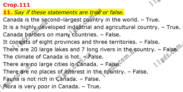 Say if these statements are true or false. Canada is the second–largest country in the world. – True. It is a highly developed industrial and agricultural country. – True. Canada borders on many countries. – False. It consists of eight provinces and three territories. – False. There are 20 large lakes and 7 long rivers in the country. – False. The climate of Canada is hot. – False. There are no large cities in Canada. – False. There are no places of interest in the country. – False. Fauna is not rich in Canada. – False. Flora is very poor in Canada. – True.
