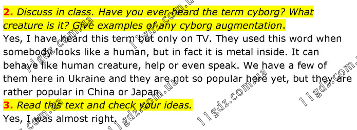 2. Discuss in class. Have you ever heard the term cyborg? What creature is it? Give examples of any cyborg augmentation. Yes, I have heard this term but only on TV. They used this word when somebody looks like a human, but in fact it is metal inside. It can behave like human creature, help or even speak. We have a few of them here in Ukraine and they are not so popular here yet, but they are rather popular in China or Japan. 3. Read this text and check your ideas. Yes, I was almost right.