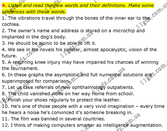 Listen and read the new words and their definitions. Make some sentences with these words. 1. The vibrations travel through the bones of the inner ear to the cochlea. 2. The owner's name and address is stored on a microchip and implanted in the dog's body. 3. He should be bionic to be able to lift it. 4. We see in his novels his sinister, almost apocalyptic, vision of the future. 5. A recurring knee injury may have impaired his chances of winning the tournament. 6. In these graphs the asymptotic and full numerical solutions are superimposed for comparison. 7. Let us take referrals of new ophthalmology outpatients. 8. The child vanished while on her way home from school. 9. Polish your shoes regularly to protect the leather. 10. He's one of those people with a very vivid imagination – every time he hears a noise he's convinced it's someone breaking in. 11. The film was banned in several countries. 12. I think of making computers smarter as intelligence augmentation.
