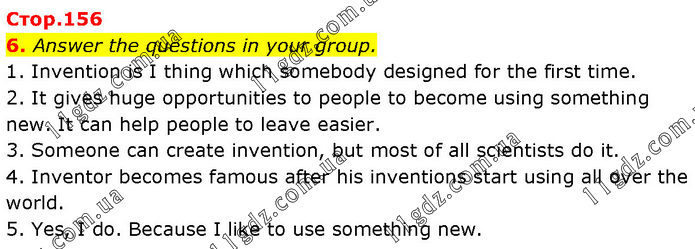 Answer the questions in your group. 1. Invention is I thing which somebody designed for the first time. 2. It gives huge opportunities to people to become using something new. It can help people to leave easier. 3. Someone can create invention, but most of all scientists do it. 4. Inventor becomes famous after his inventions start using all over the world. 5. Yes, I do. Because I like to use something new.