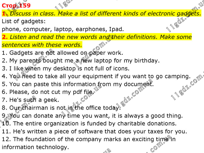1. Discuss in class. Make a list of different kinds of electronic gadgets. List of gadgets: phone, computer, laptop, earphones, Ipad. 2. Listen and read the new words and their definitions. Make some sentences with these words. 1. Gadgets are not allowed on paper work. 2. My parents bought me a new laptop for my birthday. 3. I like when my desktop is not full of icons. 4. You need to take all your equipment if you want to go camping. 5. You can paste this information from my document. 6. Please, do not cut my pdf file. 7. He's such a geek. 8. Our chairman is not in the office today. 9. You can donate any time you want, it is always a good thing. 10. The entire organization is funded by charitable donations. 11. He's written a piece of software that does your taxes for you. 12. The foundation of the company marks an exciting time in information technology.