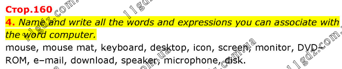 Name and write all the words and expressions you can associate with the word computer. mouse, mouse mat, keyboard, desktop, icon, screen, monitor, DVD–ROM, e–mail, download, speaker, microphone, disk.