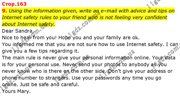 Using the information given, write an e–mail with advice and tips on Internet safety rules to your friend who is not feeling very confident about Internet safety. Dear Sandra, Nice to hear from you! Hope you and your family are ok. You informed me that you are not sure how to use Internet safety. I can give you a few tips regarding it. The main rule is never give your personal information online. Your data is for your personal use. Never send your photos to anybody as you never know who is there on the other side. Don’t give your address or phone number to strangers. Use your passwords any time you go online. Just be safe and careful. Yours Mary.