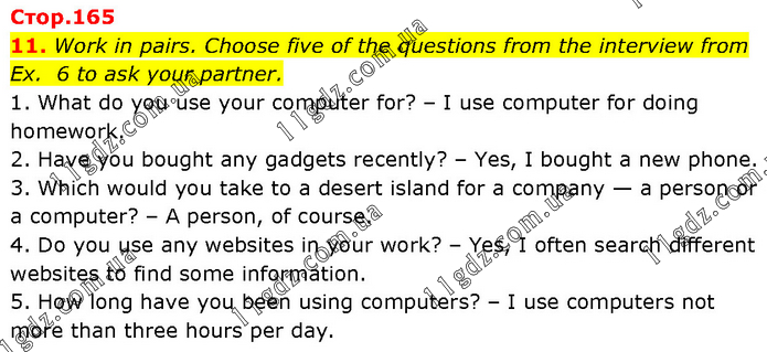 Work in pairs. Choose five of the questions from the interview from Ex. 6 to ask your partner. 1. What do you use your computer for? – I use computer for doing homework. 2. Have you bought any gadgets recently? – Yes, I bought a new phone. 3. Which would you take to a desert island for a company — a person or a computer? – A person, of course. 4. Do you use any websites in your work? – Yes, I often search different websites to find some information. 5. How long have you been using computers? – I use computers not more than three hours per day.