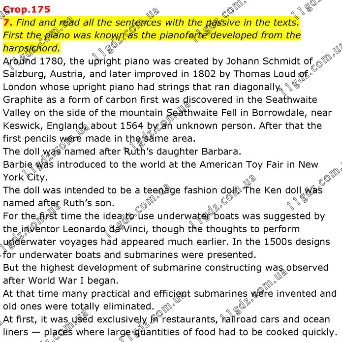 Find and read all the sentences with the passive in the texts. First the piano was known as the pianoforte developed from the harpsichord. Around 1780, the upright piano was created by Johann Schmidt of Salzburg, Austria, and later improved in 1802 by Thomas Loud of London whose upright piano had strings that ran diagonally. Graphite as a form of carbon first was discovered in the Seathwaite Valley on the side of the mountain Seathwaite Fell in Borrowdale, near Keswick, England, about 1564 by an unknown person. After that the first pencils were made in the same area. The doll was named after Ruth’s daughter Barbara. Barbie was introduced to the world at the American Toy Fair in New York City. The doll was intended to be a teenage fashion doll. The Ken doll was named after Ruth’s son. For the first time the idea to use underwater boats was suggested by the inventor Leonardo da Vinci, though the thoughts to perform underwater voyages had appeared much earlier. In the 1500s designs for underwater boats and submarines were presented. But the highest development of submarine constructing was observed after World War I began. At that time many practical and efficient submarines were invented and old ones were totally eliminated. At first, it was used exclusively in restaurants, railroad cars and ocean liners — places where large quantities of food had to be cooked quickly.