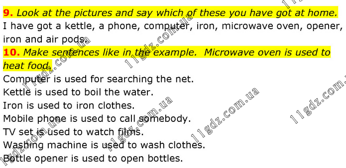 9. Look at the pictures and say which of these you have got at home. I have got a kettle, a phone, computer, iron, microwave oven, opener, iron and air pods. 10. Make sentences like in the example. Microwave oven is used to heat food. Computer is used for searching the net. Kettle is used to boil the water. Iron is used to iron clothes. Mobile phone is used to call somebody. TV set is used to watch films. Washing machine is used to wash clothes. Bottle opener is used to open bottles.