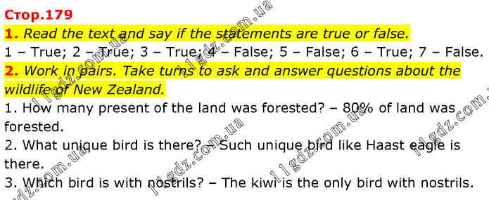 1. Read the text and say if the statements are true or false. 1 – True; 2 – True; 3 – True; 4 – False; 5 – False; 6 – True; 7 – False. 2. Work in pairs. Take turns to ask and answer questions about the wildlife of New Zealand. 1. How many present of the land was forested? – 80% of land was forested. 2. What unique bird is there? – Such unique bird like Haast eagle is there. 3. Which bird is with nostrils? – The kiwi is the only bird with nostrils.