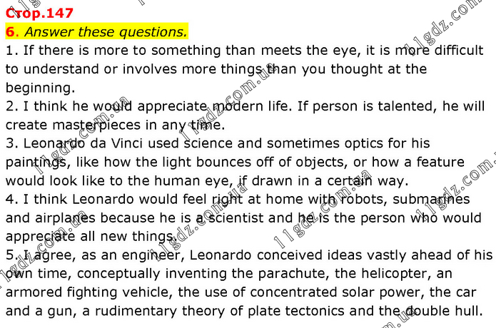 Answer these questions. 1. If there is more to something than meets the eye, it is more difficult to understand or involves more things than you thought at the beginning. 2. I think he would appreciate modern life. If person is talented, he will create masterpieces in any time. 3. Leonardo da Vinci used science and sometimes optics for his paintings, like how the light bounces off of objects, or how a feature would look like to the human eye, if drawn in a certain way. 4. I think Leonardo would feel right at home with robots, submarines and airplanes because he is a scientist and he is the person who would appreciate all new things. 5. I agree, as an engineer, Leonardo conceived ideas vastly ahead of his own time, conceptually inventing the parachute, the helicopter, an armored fighting vehicle, the use of concentrated solar power, the car and a gun, a rudimentary theory of plate tectonics and the double hull.