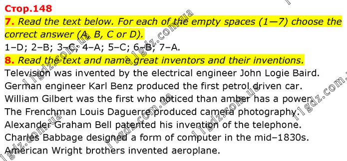 7. Read the text below. For each of the empty spaces (1—7) choose the correct answer (A, B, C or D). 1–D; 2–B; 3–C; 4–A; 5–C; 6–B; 7–A. 8. Read the text and name great inventors and their inventions. Television was invented by the electrical engineer John Logie Baird. German engineer Karl Benz produced the first petrol driven car. William Gilbert was the first who noticed than amber has a power. The Frenchman Louis Daguerre produced camera photography. Alexander Graham Bell patented his invention of the telephone. Charles Babbage designed a form of computer in the mid–1830s. American Wright brothers invented aeroplane.