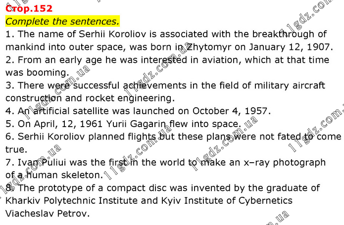 Complete the sentences. 1. The name of Serhii Koroliov is associated with the breakthrough of mankind into outer space, was born in Zhytomyr on January 12, 1907. 2. From an early age he was interested in aviation, which at that time was booming. 3. There were successful achievements in the field of military aircraft construction and rocket engineering. 4. An artificial satellite was launched оn October 4, 1957. 5. On April, 12, 1961 Yurii Gagarin flew into space. 6. Serhii Koroliov planned flights but these plans were not fated to come true. 7. Ivan Puliui was the first in the world to make an x–ray photograph of a human skeleton. 8. The prototype of a compact disc was invented by the graduate of Kharkiv Polytechnic Institute and Kyiv Institute of Cybernetics Viacheslav Petrov.