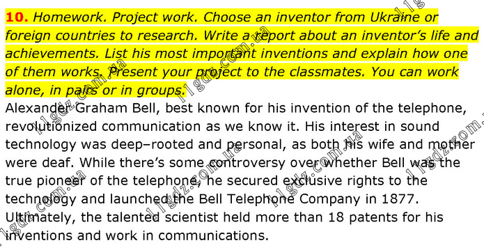 Homework. Project work. Choose an inventor from Ukraine or foreign countries to research. Write a report about an inventor’s life and achievements. List his most important inventions and explain how one of them works. Present your project to the classmates. You can work alone, in pairs or in groups. Alexander Graham Bell, best known for his invention of the telephone, revolutionized communication as we know it. His interest in sound technology was deep–rooted and personal, as both his wife and mother were deaf. While there’s some controversy over whether Bell was the true pioneer of the telephone, he secured exclusive rights to the technology and launched the Bell Telephone Company in 1877. Ultimately, the talented scientist held more than 18 patents for his inventions and work in communications.