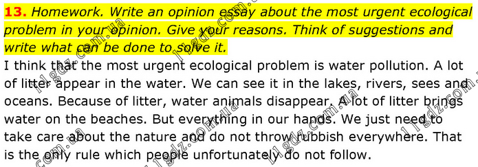 Homework. Write an opinion essay about the most urgent ecological problem in your opinion. Give your reasons. Think of suggestions and write what can be done to solve it. I think that the most urgent ecological problem is water pollution. A lot of litter appear in the water. We can see it in the lakes, rivers, sees and oceans. Because of litter, water animals disappear. A lot of litter brings water on the beaches. But everything in our hands. We just need to take care about the nature and do not throw rubbish everywhere. That is the only rule which people unfortunately do not follow.