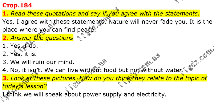 1. Read these quotations and say if you agree with the statements. Yes, I agree with these statements. Nature will never fade you. It is the place where you can find peace. 2. Answer the questions 1. Yes, I do. 2. Yes, it is. 3. We will ruin our mind. 4. No, it isn’t. We can live without food but not without water. 3. Look at these pictures. How do you think they relate to the topic of today’s lesson? I think we will speak about power supply and electricity.
