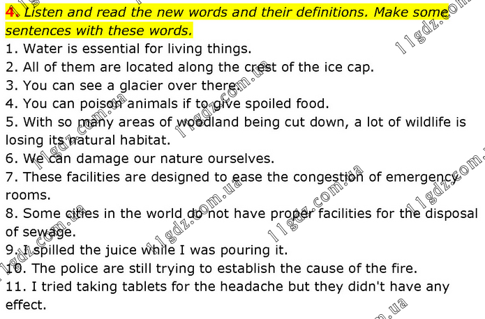Listen and read the new words and their definitions. Make some sentences with these words. 1. Water is essential for living things. 2. All of them are located along the crest of the ice cap. 3. You can see a glacier over there. 4. You can poison animals if to give spoiled food. 5. With so many areas of woodland being cut down, a lot of wildlife is losing its natural habitat. 6. We can damage our nature ourselves. 7. These facilities are designed to ease the congestion of emergency rooms. 8. Some cities in the world do not have proper facilities for the disposal of sewage. 9. I spilled the juice while I was pouring it. 10. The police are still trying to establish the cause of the fire. 11. I tried taking tablets for the headache but they didn't have any effect.
