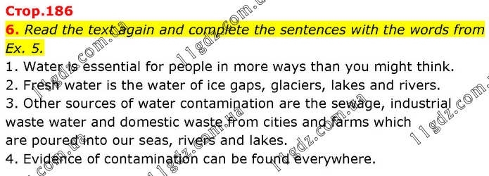 Read the text again and complete the sentences with the words from Ex. 5. 1. Water is essential for people in more ways than you might think. 2. Fresh water is the water of ice gaps, glaciers, lakes and rivers. 3. Other sources of water contamination are the sewage, industrial waste water and domestic waste from cities and farms which are poured into our seas, rivers and lakes. 4. Evidence of contamination can be found everywhere.