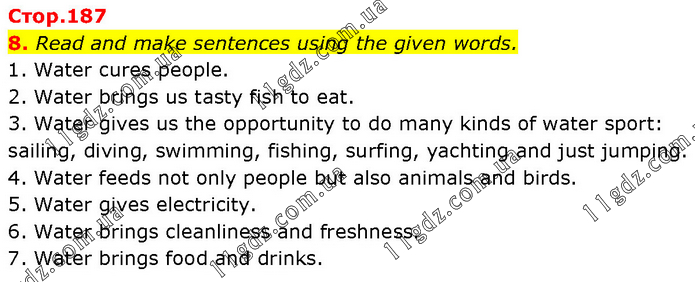 Read and make sentences using the given words. 1. Water cures people. 2. Water brings us tasty fish to eat. 3. Water gives us the opportunity to do many kinds of water sport: sailing, diving, swimming, fishing, surfing, yachting and just jumping. 4. Water feeds not only people but also animals and birds. 5. Water gives electricity. 6. Water brings cleanliness and freshness. 7. Water brings food and drinks.