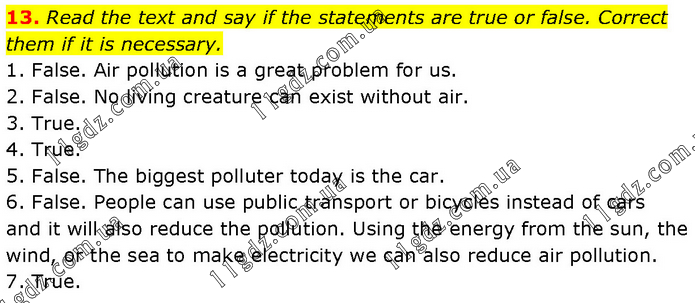 Read the text and say if the statements are true or false. Correct them if it is necessary. 1. False. Air pollution is a great problem for us. 2. False. No living creature can exist without air. 3. True. 4. True. 5. False. The biggest polluter today is the car. 6. False. People can use public transport or bicycles instead of cars and it will also reduce the pollution. Using the energy from the sun, the wind, or the sea to make electricity we can also reduce air pollution. 7. True.