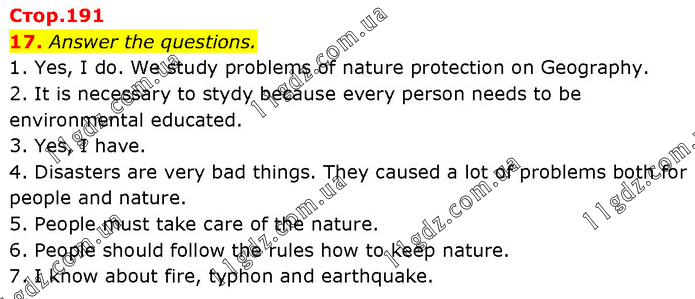 Answer the questions. 1. Yes, I do. We study problems of nature protection on Geography. 2. It is necessary to stydy because every person needs to be environmental educated. 3. Yes, I have. 4. Disasters are very bad things. They caused a lot of problems both for people and nature. 5. People must take care of the nature. 6. People should follow the rules how to keep nature. 7. I know about fire, typhon and earthquake.