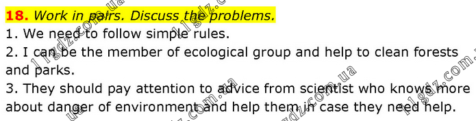 Work in pairs. Discuss the problems. 1. We need to follow simple rules. 2. I can be the member of ecological group and help to clean forests and parks. 3. They should pay attention to advice from scientist who knows more about danger of environment and help them in case they need help.