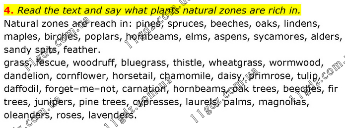 Read the text and say what plants natural zones are rich in. Natural zones are reach in: pines, spruces, beeches, oaks, lindens, maples, birches, poplars, hornbeams, elms, aspens, sycamores, alders, sandy spits, feather. grass, fescue, woodruff, bluegrass, thistle, wheatgrass, wormwood, dandelion, cornflower, horsetail, chamomile, daisy, primrose, tulip, daffodil, forget–me–not, carnation, hornbeams, oak trees, beeches, fir trees, junipers, pine trees, cypresses, laurels, palms, magnolias, oleanders, roses, lavenders.
