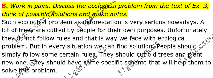Work in pairs. Discuss the ecological problem from the text of Ex. 3, think of possible solutions and make notes. Such ecological problem as deforestation is very serious nowadays. A lot of trees are cutted by people for their own purposes. Unfortunately they do not follow rules and that is way we face with ecological problem. But in every situation we can find solution. People should simply follow some certain rules. They should cut old trees and plant new one. They should have some specific scheme that will help them to solve this problem.
