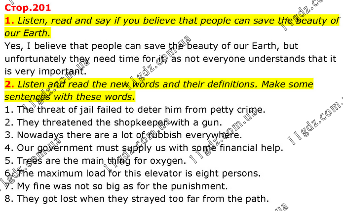1. Listen, read and say if you believe that people can save the beauty of our Earth. Yes, I believe that people can save the beauty of our Earth, but unfortunately they need time for it, as not everyone understands that it is very important. 2. Listen and read the new words and their definitions. Make some sentences with these words. 1. The threat of jail failed to deter him from petty crime. 2. They threatened the shopkeeper with a gun. 3. Nowadays there are a lot of rubbish everywhere. 4. Our government must supply us with some financial help. 5. Trees are the main thing for oxygen. 6. The maximum load for this elevator is eight persons. 7. My fine was not so big as for the punishment. 8. They got lost when they strayed too far from the path.
