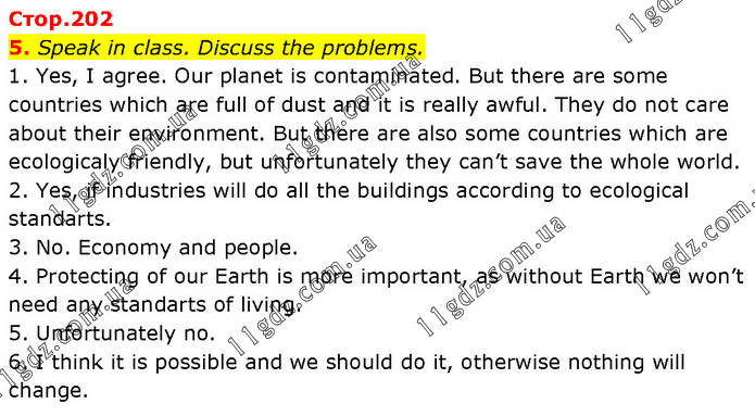 Speak in class. Discuss the problems. 1. Yes, I agree. Our planet is contaminated. But there are some countries which are full of dust and it is really awful. They do not care about their environment. But there are also some countries which are ecologicaly friendly, but unfortunately they can’t save the whole world. 2. Yes, if industries will do all the buildings according to ecological standarts. 3. No. Economy and people. 4. Protecting of our Earth is more important, as without Earth we won’t need any standarts of living. 5. Unfortunately no. 6. I think it is possible and we should do it, otherwise nothing will change.