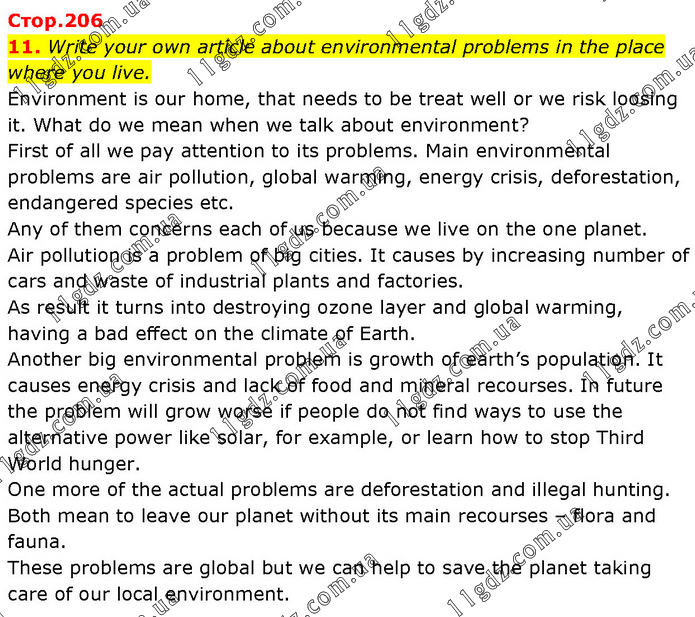 Write your own article about environmental problems in the place where you live. Environment is our home, that needs to be treat well or we risk loosing it. What do we mean when we talk about environment? First of all we pay attention to its problems. Main environmental problems are air pollution, global warming, energy crisis, deforestation, endangered species etc. Any of them concerns each of us because we live on the one planet. Air pollution is a problem of big cities. It causes by increasing number of cars and waste of industrial plants and factories. As result it turns into destroying ozone layer and global warming, having a bad effect on the climate of Earth. Another big environmental problem is growth of earth’s population. It causes energy crisis and lack of food and mineral recourses. In future the problem will grow worse if people do not find ways to use the alternative power like solar, for example, or learn how to stop Third World hunger. One more of the actual problems are deforestation and illegal hunting. Both mean to leave our planet without its main recourses – flora and fauna. These problems are global but we can help to save the planet taking care of our local environment.