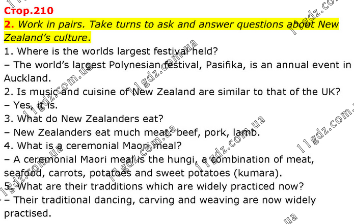 Work in pairs. Take turns to ask and answer questions about New Zealand’s culture. 1. Where is the worlds largest festival held? – The world’s largest Polynesian festival, Pasifika, is an annual event in Auckland. 2. Is music and cuisine of New Zealand are similar to that of the UK? – Yes, it is. 3. What do New Zealanders eat? – New Zealanders eat much meat: beef, pork, lamb. 4. What is a ceremonial Maori meal? – A ceremonial Maori meal is the hungi, a combination of meat, seafood, carrots, potatoes and sweet potatoes (kumara). 5. What are their tradditions which are widely practiced now? – Their traditional dancing, carving and weaving are now widely practised.