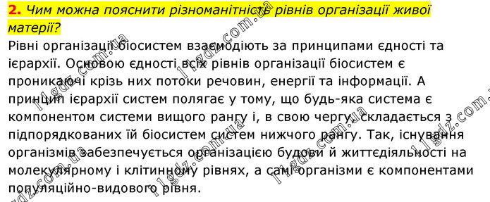 Чим можна пояснити різноманітність рівнів організації живої матерії? Рівні організації біосистем взаємодіють за принципами єдності та ієрархії. Основою єдності всіх рівнів організації біосистем є проникаючі крізь них потоки речовин, енергії та інформації. А принцип ієрархії систем полягає у тому, що будь-яка система є компонентом системи вищого рангу і, в свою чергу, складається з підпорядкованих їй біосистем систем нижчого рангу. Так, існування організмів забезпечується організацією будови й життєдіяльності на молекулярному і клітинному рівнях, а самі організми є компонентами популяційно-видового рівня.