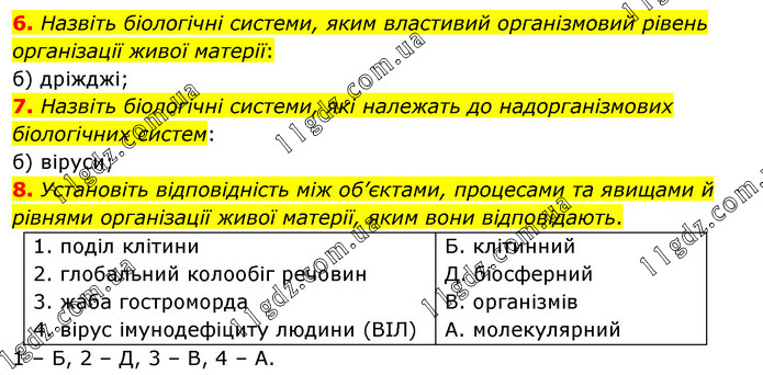 Назвіть біологічні системи, яким властивий організмовий рівень організації живої матерії: б) дріжджі; 7. Назвіть біологічні системи, які належать до надорганізмових біологічних систем: б) віруси; 8. Установіть відповідність між об’єктами, процесами та явищами й рівнями організації живої матерії, яким вони відповідають. 1. поділ клітини 2. глобальний колообіг речовин 3. жаба гостроморда 4. вірус імунодефіциту людини (ВІЛ) Б. клітинний Д. біосферний В. організмів А. молекулярний 1 – Б, 2 – Д, 3 – В, 4 – А.