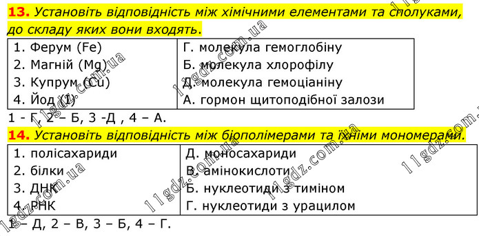 Установіть відповідність між хімічними елементами та сполуками, до складу яких вони входять. 1. Ферум (Fe) 2. Магній (Mg) 3. Купрум (Cu) 4. Йод (I) Г. молекула гемоглобіну Б. молекула хлорофілу Д. молекула гемоціаніну А. гормон щитоподібної залози 1 - Г, 2 – Б, 3 -Д , 4 – А. 14. Установіть відповідність між біополімерами та їхніми мономерами. 1. полісахариди 2. білки 3. ДНК 4. РНК Д. моносахариди В. амінокислоти Б. нуклеотиди з тиміном Г. нуклеотиди з урацилом 1 – Д, 2 – В, 3 – Б, 4 – Г.