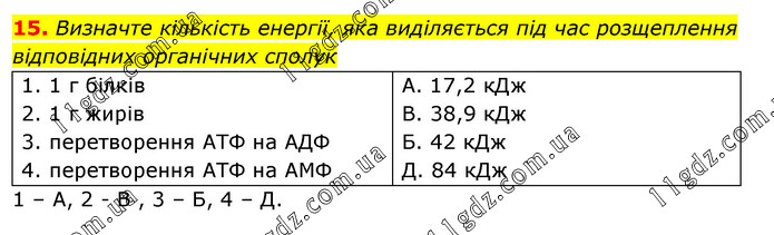 Визначте кількість енергії, яка виділяється під час розщеплення відповідних органічних сполук 1. 1 г білків 2. 1 г жирів 3. перетворення АТФ на АДФ 4. перетворення АТФ на АМФ А. 17,2 кДж В. 38,9 кДж Б. 42 кДж Д. 84 кДж 1 – А, 2 - В , 3 – Б, 4 – Д.