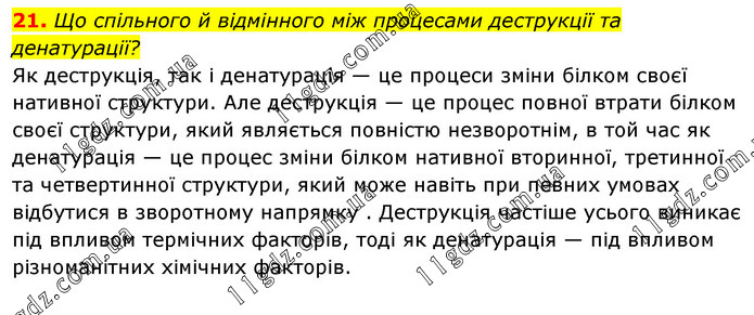 Що спільного й відмінного між процесами деструкції та денатурації? Як деструкція, так і денатурація — це процеси зміни білком своєї нативної структури. Але деструкція — це процес повної втрати білком своєї структури, який являється повністю незворотнім, в той час як денатурація — це процес зміни білком нативної вторинної, третинної та четвертинної структури, який може навіть при певних умовах відбутися в зворотному напрямку . Деструкція частіше усього виникає під впливом термічних факторів, тоді як денатурація — під впливом різноманітних хімічних факторів.