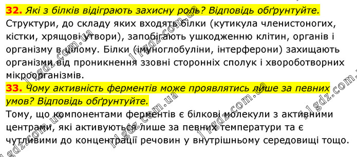 Які з білків відіграють захисну роль? Відповідь обґрунтуйте. Структури, до складу яких входять білки (кутикула членистоногих, кістки, хрящові утвори), запобігають ушкодженню клітин, органів і організму в цілому. Білки (імуноглобуліни, інтерферони) захищають організми від проникнення ззовні сторонніх сполук і хвороботворних мікроорганізмів. 33. Чому активність ферментів може проявлятись лише за певних умов? Відповідь обґрунтуйте. Тому, що компонентами ферментів є білкові молекули з активними центрами, які активуються лише за певних температури та є чутливими до концентрації речовин у внутрішньому середовищі тощо.