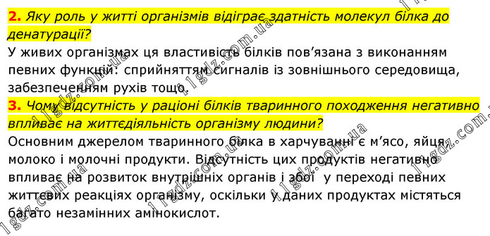 Яку роль у житті організмів відіграє здатність молекул білка до денатурації? У живих організмах ця властивість білків пов’язана з виконанням певних функцій: сприйняттям сигналів із зовнішнього середовища, забезпеченням рухів тощо. 3. Чому відсутність у раціоні білків тваринного походження негативно впливає на життєдіяльність організму людини? Основним джерелом тваринного білка в харчуванні є м’ясо, яйця, молоко і молочні продукти. Відсутність цих продуктів негативно впливає на розвиток внутрішніх органів і збої у переході певних життєвих реакціях організму, оскільки у даних продуктах містяться багато незамінних амінокислот.