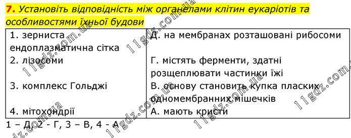 Установіть відповідність між органелами клітин еукаріотів та особливостями їхньої будови 1. зерниста ендоплазматична сітка 2. лізосоми 3. комплекс Гольджі 4. мітохондрії Д. на мембранах розташовані рибосоми Г. містять ферменти, здатні розщеплювати частинки їжі В. основу становить купка пласких одномембранних мішечків А. мають кристи 1 – Д, 2 - Г, 3 – В, 4 - А