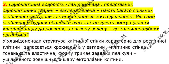 Одноклітинна водорість хламідомонада і представник одноклітинних тварин – евглена зелена – мають багато спільних особливостей будови клітини і процесів життєдіяльності. Які саме особливості будови оболонки їхніх клітин дають змогу віднести хламідомонаду до рослини, а евглену зелену – до твариноподібних організмів? У хламідомонади структура клітинної стінки характерна для рослинної клітини і запасається крохмаль, а у евглени – клітинна стінка тоненька та еластична, форму тримає завдяки пелікули – ущільненого зовнішнього шару ектоплазми клітини.