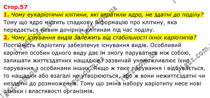 1. Чому еукаріотичні клітини, які втратили ядро, не здатні до поділу? Тому що ядро містить спадкову інформацію про клітину, яка передається новим дочірнім клітинам під час поділу. 2. Чому існування видів залежить від стабільності їхніх каріотипів? Постійність Каріотипу забезпечує існування видів. Особливий каріотип особин одного виду дає їм змогу паруватися між собою, залишати життєздатних нащадків і зазвичай унеможливлює їхнє парування з особинами інших. Якщо ж таке парування і відбувається, то нащадки або взагалі не утворюються, або ж вони нежиттєздатні чи нездатні до розмноження. Тому що зміна набору каріотипу несе нові ознаки і властивості організмів.