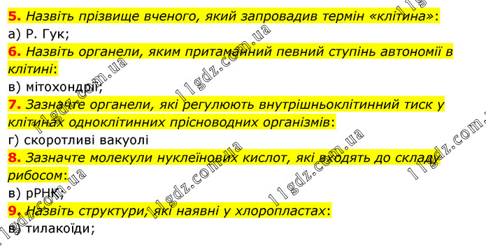 Назвіть прізвище вченого, який запровадив термін «клітина»: а) Р. Гук; 6. Назвіть органели, яким притаманний певний ступінь автономії в клітині: в) мітохондрії; 7. Зазначте органели, які регулюють внутрішньоклітинний тиск у клітинах одноклітинних прісноводних організмів: г) скоротливі вакуолі 8. Зазначте молекули нуклеїнових кислот, які входять до складу рибосом: в) рРНК; 9. Назвіть структури, які наявні у хлоропластах: в) тилакоїди;