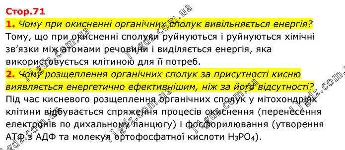 Чому при окисненні органічних сполук вивільняється енергія? Тому, що при окисненні сполуки руйнуються і руйнуються хімічні зв’язки між атомами речовини і виділяється енергія, яка використовується клітиною для її потреб. 2. Чому розщеплення органічних сполук за присутності кисню виявляється енергетично ефективнішим, ніж за його відсутності? Під час кисневого розщеплення органічних сполук у мітохондріях клітини відбувається спряження процесів окиснення (перенесення електронів по дихальному ланцюгу) і фосфорилювання (утворення АТФ з АДФ та молекул ортофосфатної кислоти Н3РО4).