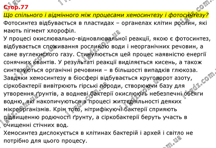 Що спільного і відмінного між процесами хемосинтезу і фотосинтезу? Фотосинтез відбувається в пластидах – органелах клітин рослин, які мають пігмент хлорофіл. У процесі окислювально-відновлювальної реакції, якою є фотосинтез, відбувається споживання рослиною води і неорганічних речовин, а саме вуглекислого газу. Стимулюється цей процес наявністю енергії сонячних квантів. У результаті реакції виділяється кисень, а також синтезуються органічні речовини – в більшості випадків глюкоза. Завдяки хемосинтезу в біосфері відбувається круговорот азоту, сіркобактерії вивітрюють гірські породи, створюючи базу для утворення ґрунтів, а водневі бактерії окислюють небезпечні обсяги водню, які накопичуються в процесі життєдіяльності деяких мікроорганізмів. Крім того, нітрифікуючі бактерії сприяють підвищенню родючості ґрунту, а сіркобактерії беруть участь в очищенні стічних вод. Хемосинтез дислокується в клітинах бактерій і архей і світло не потрібно для цього процесу.