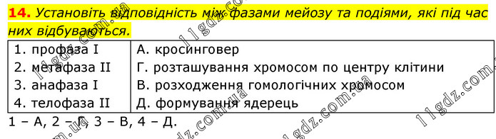 Установіть відповідність між фазами мейозу та подіями, які під час них відбуваються. 1. профаза І 2. метафаза ІІ 3. анафаза І 4. телофаза ІІ А. кросинговер Г. розташування хромосом по центру клітини В. розходження гомологічних хромосом Д. формування ядерець 1 – А, 2 – Г, 3 – В, 4 – Д.