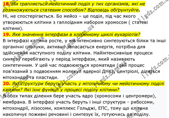 Чи трапляється мейотичний поділ у тих організмів, які не розмножуються статевим способом? Відповідь обґрунтуйте. Ні, не спостерігається. Бо мейоз – це поділ, під час якого утворюються клітини з гаплоїдним набором хромосом ( статеві клітини). 19. Яке значення інтерфази в клітинному циклі еукаріотів? В інтерфазі клітина росте, у ній інтенсивно синтезуються білки та інші органічні сполуки, активно запасається енергія, потрібна для здійснення наступного поділу клітини. Найінтенсивніше процеси синтезу перебігають у період інтерфази, який називають синтетичним. У цей час подвоюються хроматиди (цей процес пов’язаний з подвоєнням молекул ядерної ДНК), центріолі, діляться мітохондрії та пластиди. 20. Які структури беруть участь у мітотичному чи мейотичному поділі клітини? Які їхні функції у процесі поділу клітини? В обох типах ділення бере участь ядро (хромосоми і центромери), мембрана. В інтерфазі участь беруть і інші структури - рибосоми, мітохондрії, лізосоми, комплекс Гольджі, ЕПС, тому що клітина накопичує поживні речовині і синтезує їх, готуючись до поділу.