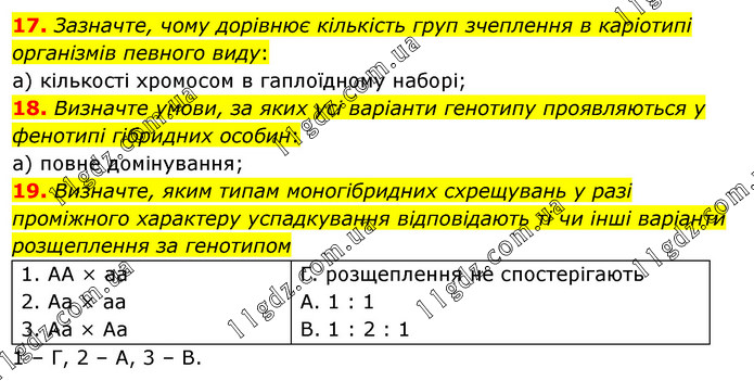 Зазначте, чому дорівнює кількість груп зчеплення в каріотипі організмів певного виду: а) кількості хромосом в гаплоїдному наборі; 18. Визначте умови, за яких усі варіанти генотипу проявляються у фенотипі гібридних особин: а) повне домінування; 19. Визначте, яким типам моногібридних схрещувань у разі проміжного характеру успадкування відповідають ті чи інші варіанти розщеплення за генотипом 1. АА × аа 2. Аа × аа 3. Аа × Аа Г. розщеплення не спостерігають А. 1 : 1 В. 1 : 2 : 1 1 – Г, 2 – А, 3 – В.