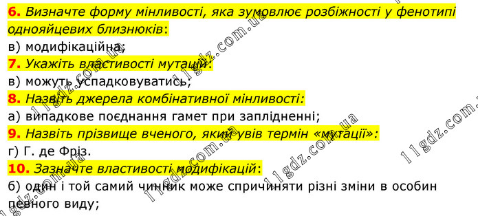 Визначте форму мінливості, яка зумовлює розбіжності у фенотипі однояйцевих близнюків: в) модифікаційна; 7. Укажіть властивості мутацій: в) можуть успадковуватись; 8. Назвіть джерела комбінативної мінливості: а) випадкове поєднання гамет при заплідненні; 9. Назвіть прізвище вченого, який увів термін «мутації»: г) Г. де Фріз. 10. Зазначте властивості модифікацій: б) один і той самий чинник може спричиняти різні зміни в особин певного виду;