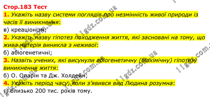 Тест 1. Укажіть назву системи поглядів про незмінність живої природи із часів її виникнення: в) креаціонізм; 2. Укажіть назву гіпотез походження життя, які засновані на тому, що жива матерія виникла з неживої: б) абіогенетичні; 3. Назвіть учених, які висунули абіогенетичну (біохімічну) гіпотезу виникнення життя: б) О. Опарін та Дж. Холдейн; 4. Укажіть період часу, коли з’явився вид Людина розумна: г) близько 200 тис. років тому.