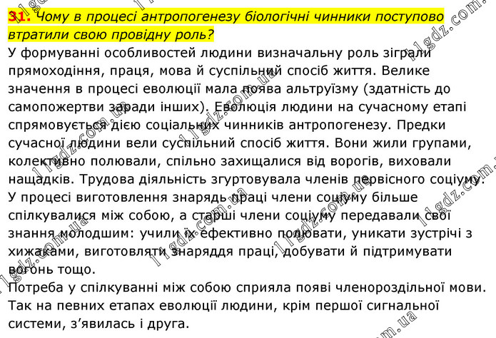 Чому в процесі антропогенезу біологічні чинники поступово втратили свою провідну роль? У формуванні особливостей людини визначальну роль зіграли прямоходіння, праця, мова й суспільний спосіб життя. Велике значення в процесі еволюції мала поява альтруїзму (здатність до самопожертви заради інших). Еволюція людини на сучасному етапі спрямовується дією соціальних чинників антропогенезу. Предки сучасної людини вели суспільний спосіб життя. Вони жили групами, колективно полювали, спільно захищалися від ворогів, виховали нащадків. Трудова діяльність згуртовувала членів первісного соціуму. У процесі виготовлення знарядь праці члени соціуму більше спілкувалися між собою, а старші члени соціуму передавали свої знання молодшим: учили їх ефективно полювати, уникати зустрічі з хижаками, виготовляти знаряддя праці, добувати й підтримувати вогонь тощо. Потреба у спілкуванні між собою сприяла появі членороздільної мови. Так на певних етапах еволюції людини, крім першої сигнальної системи, з’явилась і друга.
