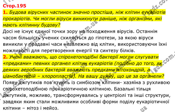 Будова вірусних частинок значно простіша, ніж клітин еукаріотів прокаріотів. Чи могли віруси виникнути раніше, ніж організми, які мають клітинну будову? Досі не існує єдиної точки зору на походження вірусів. Останнім часом більшість учених схиляється до гіпотези, за якою віруси виникли у прадавні часи незалежно від клітин, використовуючи їхні можливості для перетворення енергії та синтезу білків. 2. Учені вважають, що спірохетоподібні бактерії могли слугувати «предками» певних органел клітин еукаріотів (подібно до того, як деяких аеробних бактерій вважають предками мітохондрій, а ціанобактерій – хлоропластів). На вашу думку, що це за органели? Появу джгутиків пов’язують із симбіозом клітини- хазяїна з рухливою спірохетоподібною прокаріотичною клітиною. Базальні тільця джгутиків, можливо, трансформувались у центріолі та інші структури, завдяки яким стали можливими особливі форми поділу еукаріотичної клітини – мітоз і мейоз.